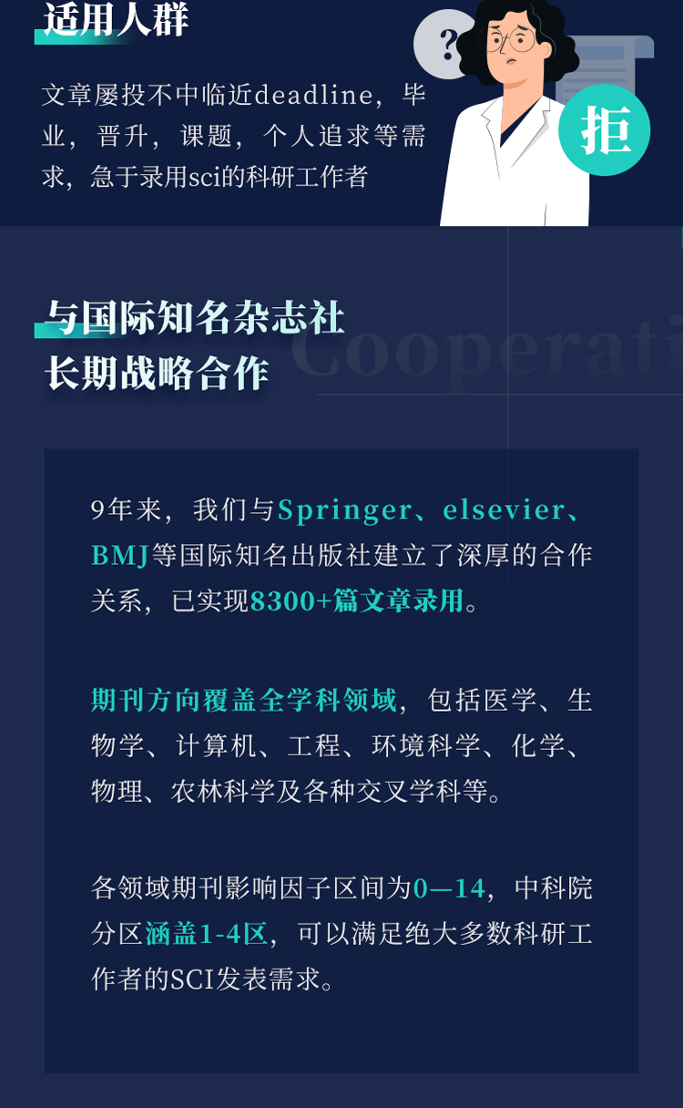 (2)目前我方合作的多为Springer,Elsevier,BMJ等大社的正规期刊,投稿及发表流程正规,期刊对稿件的主题与质量也有一定的要求,主题不符的论文难以通过内部预审,故不用担心我方推荐的期刊主题不符等等问题。