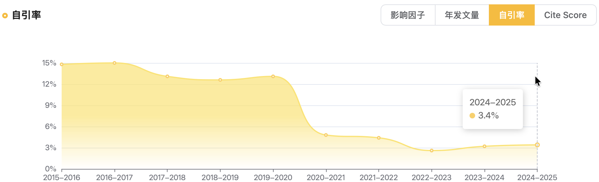 该期刊自引率近5年大幅度下降,且一直稳定在6%以下,控制的相当不错,2024-2025年自引率为3.4%。