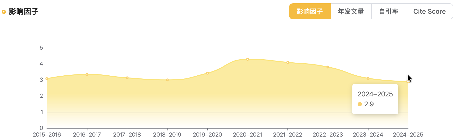 该杂志的影响因子一直维持在3分左右,但近两年影响因子开始下降,2024-2025年影响因子降至2.9分。