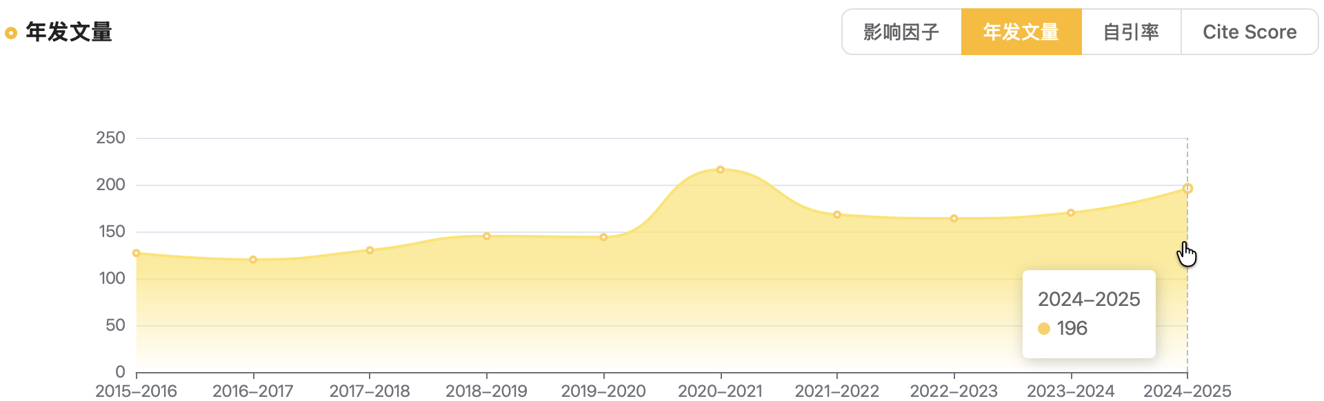 该刊近5年的年发文量比较稳定,稳中有升,2024-2025年共发文196篇,增大了中稿的概率。