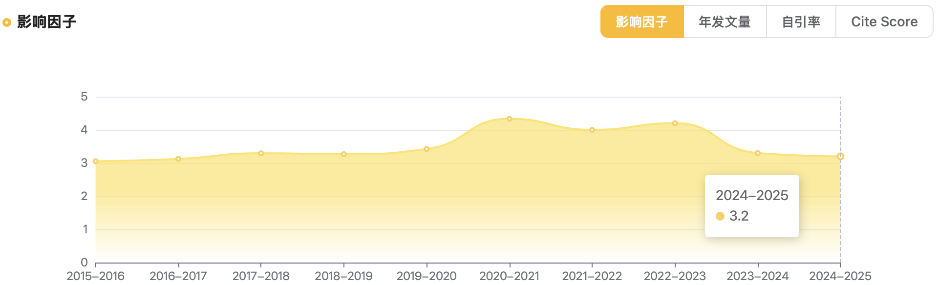 该期刊影响因子近两年开始逐渐下降,2024-2025年降为3.2分,可能与近几年发文量减少有关。