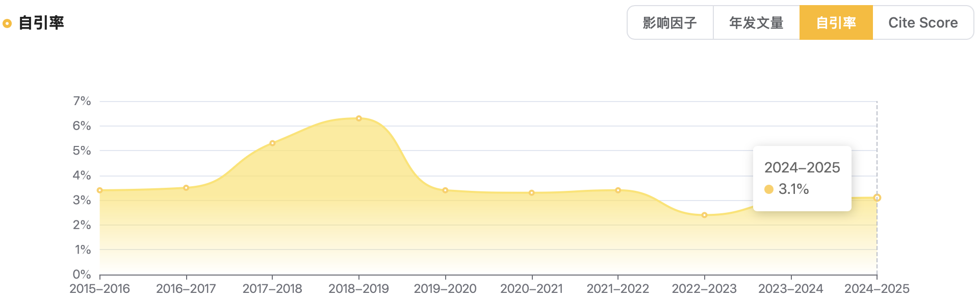 该刊自引率一直控制的不错,最高时未超过7%,2024-2025年自引率为3.1%,期刊一点都不水。